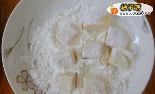 3:将豆腐块四面都裹上一层薄薄的玉米淀粉。