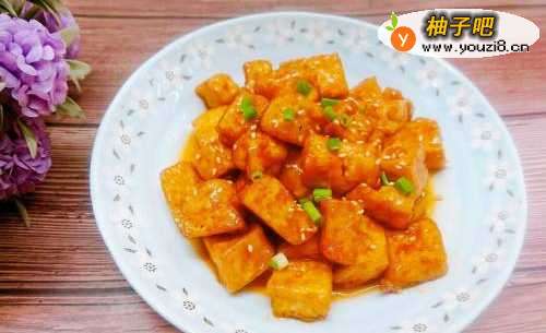 6让每块豆腐上都均匀的沾有糖醋汁,待糖醋汁变得粘稠后,便可出锅装盘。(我撒了一些葱花和白芝麻来装饰)