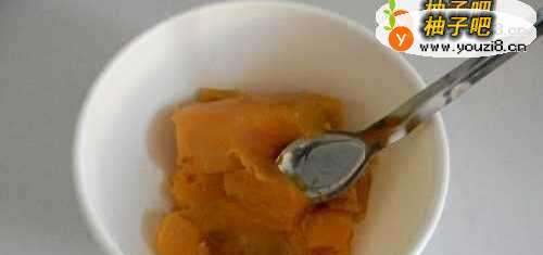 2蒸熟的地瓜趁热用勺碾成泥。