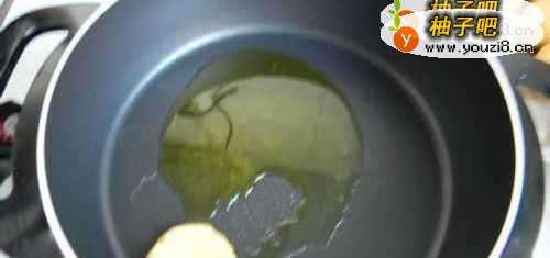 8不粘锅底中倒入3汤勺油。拿一个团好的地瓜圆团,放到油面上,手指并拢轻轻压扁有1cm厚。