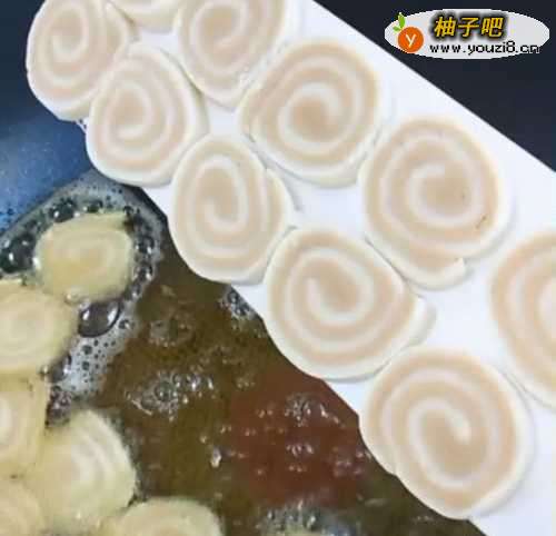 4油温五成热,下入锅中小火慢炸。