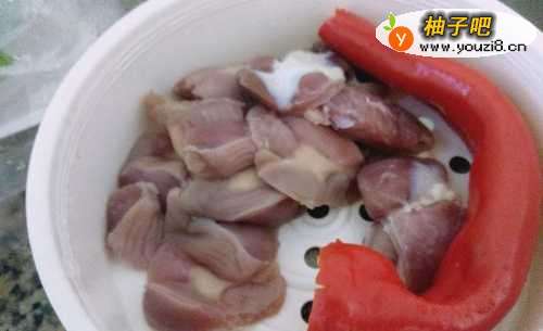 准备步骤,将鸡杂洗干净,切成一小片待用,同时辣椒洗好、大蒜薄皮切成小块等也准备好