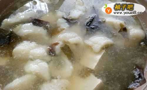备料:冻豆腐退冰;巴沙鱼排切成小块;干燥海带芽用水泡开;味噌加少许水调开。