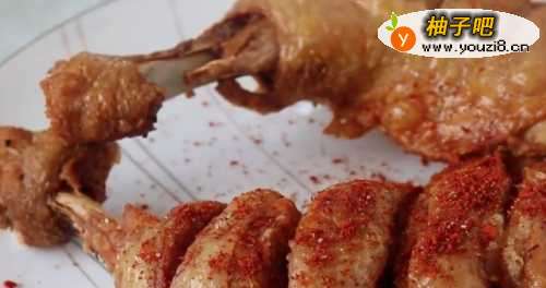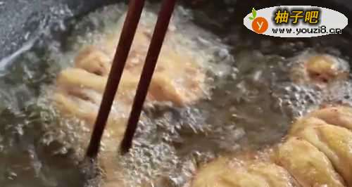 44、在锅内放入适量的油,开中小火,将油烧至6成热时,放入鸡腿,将鸡腿煎至表面金黄色。