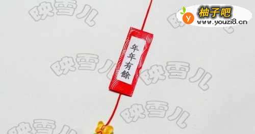9剪一张长方形的纸贴上年年有余的白字条,用透明胶粘到红绳子上,底部穿上珠子做成小春联。