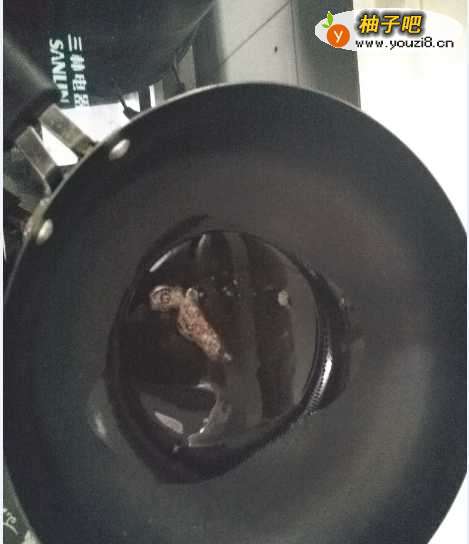 4万事具备,可以开火了,点燃气炉灶,先开抽油烟机,上铁锅(锅还是铁的好,健康补铁),加食用油,微热油,放花椒、蒜来炝锅。