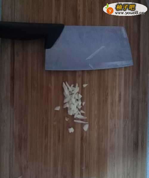 2准备辅料,准备两瓣大蒜,挑精致的剥两瓣开来,然后再找我的好伙伴菜刀王麻子,小刀口快切工,瞬间大蒜头变蒜块儿,这里注意蒜要分两份儿,留着一会儿派上用场,当然这炝锅并不是非大蒜不可,也可小葱来替换。