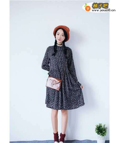 2暗色系列,并不耀眼,碎花的点缀带着一点俏皮,圆领设计更突显服装的时尚与新潮。高筒袜子与帽子的搭配是整体看起来更加文艺范