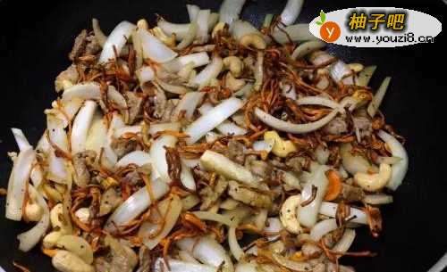 4随后加入洋葱和生腰果炒香