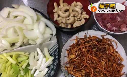 2虫草花洗干净,可加入少许水浸泡10分钟;洋葱去头尾,去皮,切粗丝;葱切段,葱白葱尾分开放;生腰果洗净