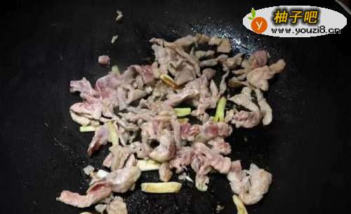 3锅内放入少许油爆香葱白至微金黄,再放入猪肉丝炒至变色