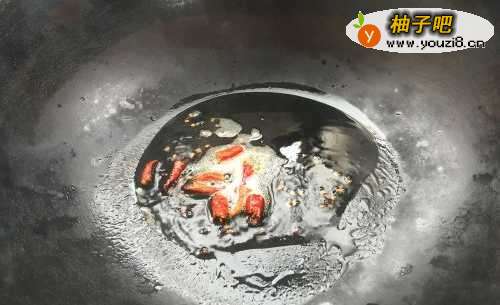 3将锅洗净,倒入少量的油,热锅。挑选两个干的红辣椒掰碎或是直接扔入锅中,翻炒,煸一煸辣椒,让辣椒炒出香味。