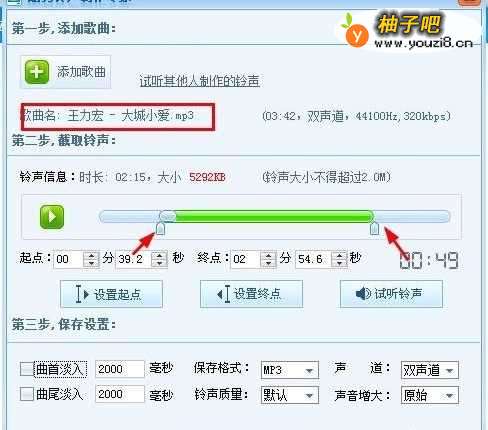 5点击打开后回到酷狗铃声制作专家界面,移动箭头所示的滑轨剪辑需要的部分