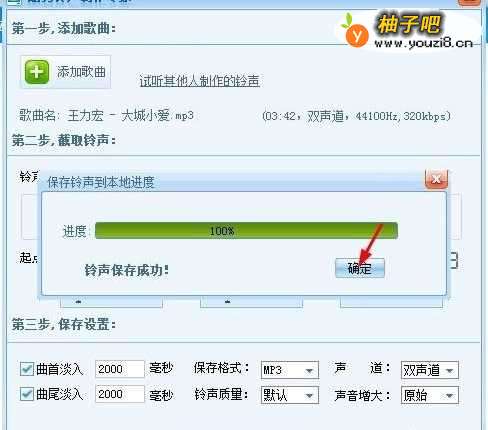 8铃声保存成功,点击确定,完成音乐剪辑