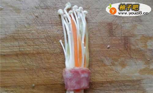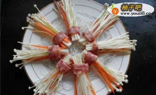 5金针菇分8份,每1份放几根红萝卜丝、莴笋丝、香肠丝,用香肠片包住。
