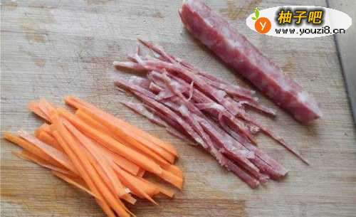 3切红萝卜丝和香肠丝。