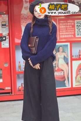 3复古文艺范儿装扮,毛衣最能表达这样的风格,蓝色高领毛衣,宽松有致的裁剪,简单的风格,清新好看,搭配阔腿裤和黑色皮鞋,美丽动人。