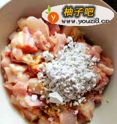 2超市打折,买了大大的手枪腿。洗净后剔骨切丁,加生抽、盐、姜末、红薯淀粉拌匀腌制一刻钟。