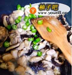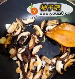 5留底油放姜丝蒜片爆香,加香菇炒半分钟,倒入鸡丁。