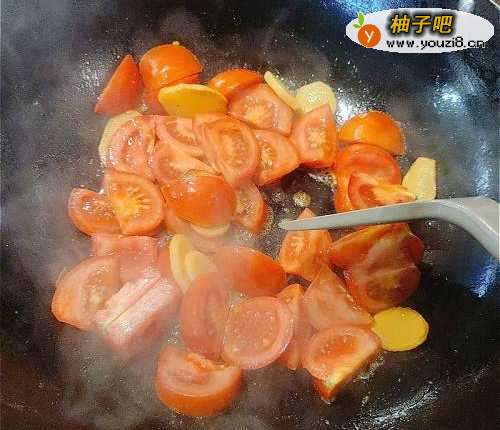 2原锅大火加入番茄炒至软身出汁,再加入热水煮滚。