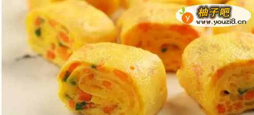 3在锅加入橄榄油加热,倒入蛋液糊小火加热,待表面蛋液要凝固时从一边将蛋饼卷起。
