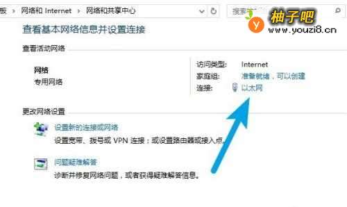 2打开网络与共享中心,选择以太网进行设置。