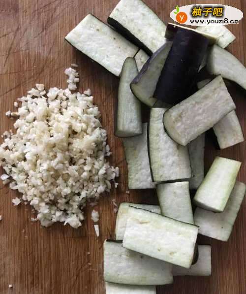 2把茄子洗干净剥开切小段。大蒜剁碎。