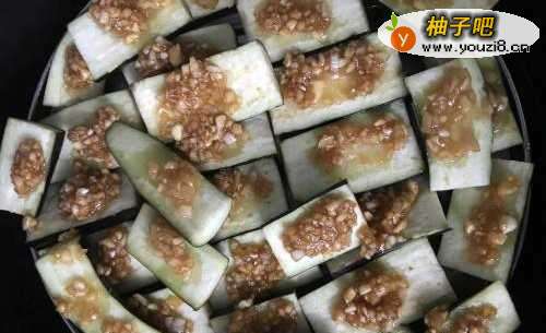 4把茄子在蒸锅里摆放好,放入调好的大蒜料。
