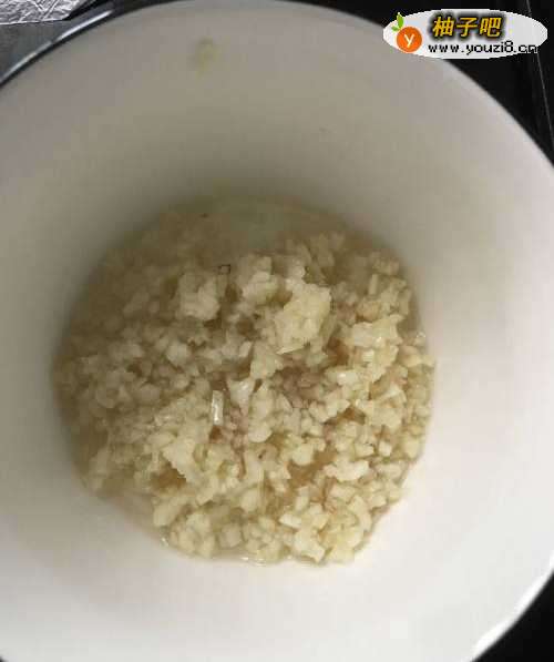 3把烧开的热油倒入剁好的大蒜里,加生抽蚝油拌匀。