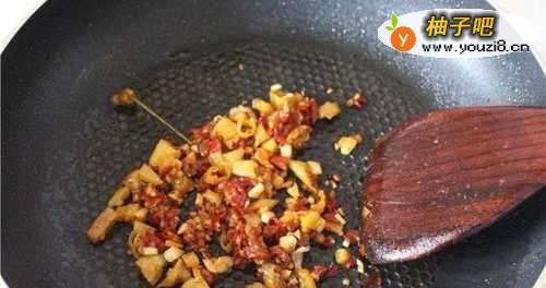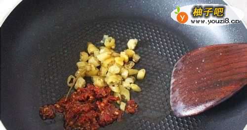 44大火加热剩下的油,放入泡椒碎粒,郫县豆瓣翻炒半分钟至出香味。