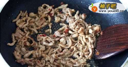 33锅里倒油烧热(冒烟),把腌好的肉丝放入热油锅内,快速拨炒30秒钟,马上离火肉丝盛出沥油。