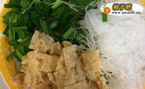 粉丝和豆皮泡水让它变软后切小段,韭菜洗净切小段