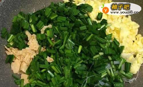 5加一小匙盐将粉丝、韭菜、豆皮翻炒均匀