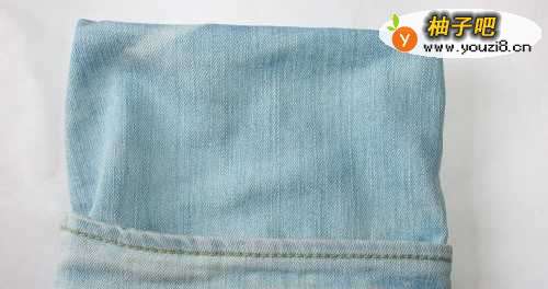 首先如图将旧牛仔裤的裤腿最下面一块裁剪下来。