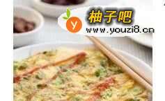6一面定型后用铲子将整个蛋饼翻面,略煎半分钟蛋液即可熟透,盛入盘中即可食用。