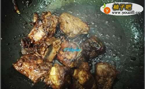 5放入前面腌制的排骨,然后大火快炒一阵,这个时候要注意,油还是比较容易飞溅出来,待酱料黏在排骨四周再加入适量热水,然后大火将水烧开。