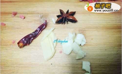 4将这些辅料都处理一下,生姜去皮切丝,蒜头拍碎切末,八角洗净,辣椒干切段。将锅清洗干净,然后沥干水渍,重新加入适量油,放入姜丝、蒜末、八角、辣椒干等爆香一会,然后加入少许白砂糖,将酱汁炒浓。