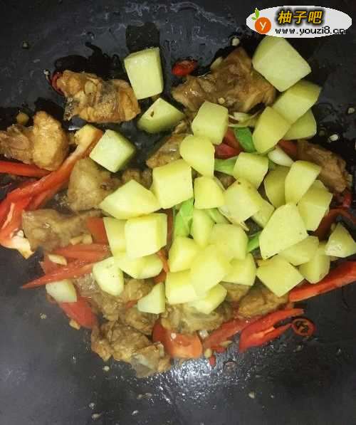 6按顺序,分别加入大红椒,土豆丁翻炒,翻炒至红椒熟了,加入用水稀释的腌制排骨酱料,盖上锅盖,小火焖5-10分钟;