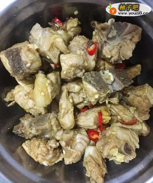3将沥干水分的排骨用酱油、料酒、朝天椒、蒜头腌制10分钟;