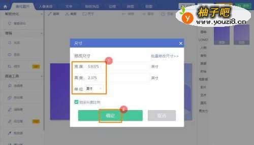 3在尺寸对话框,选择单位【英寸】,输入【宽、高度】,点击【确定】即可。