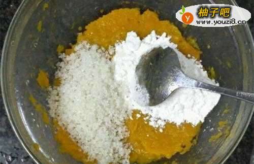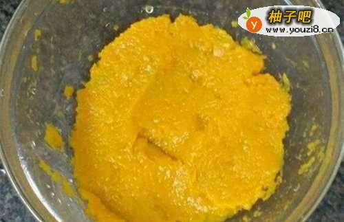 2把蒸熟的南瓜倒入容器中,用铲子压碎成糊状
