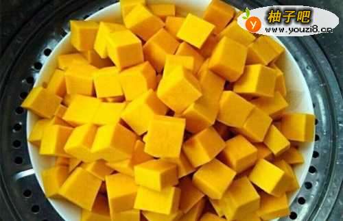 南瓜洗净削皮,切成小块装盘蒸熟