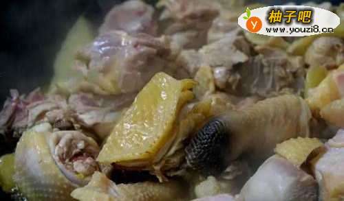 3将事先烫过的鸡腿肉放入锅中煸炒出香气,把外表的鸡皮煎至有些金黄焦香