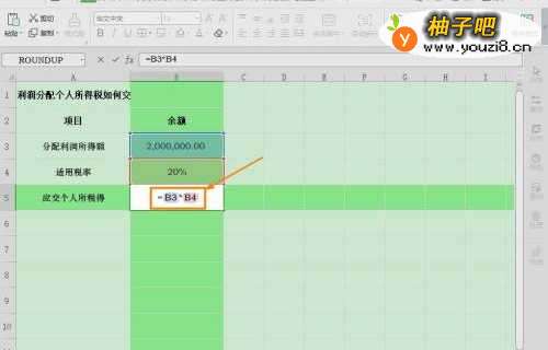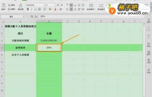 2选择单元格【B4】,按“利息、股息、红利所得”项目计征个人所得税,输入适用税率【20%】。
