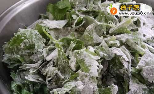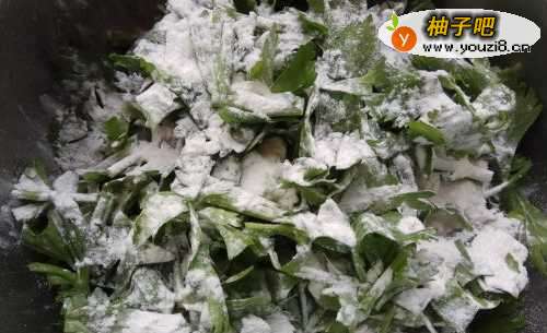2然后,将空好水的芹菜叶子放在一盆中,然后加白面粉,边加边搅拌均匀。