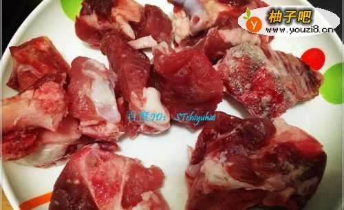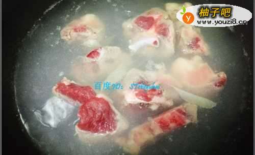 4将大骨放入水中焯一阵,往汤中加入少许盐巴和醋,如果产生较多泡沫,用勺子剔除,将骨头捞出放入冷水中过一遍,然后沥干,加入少许盐巴、酱油、料酒、醋等腌制一会。