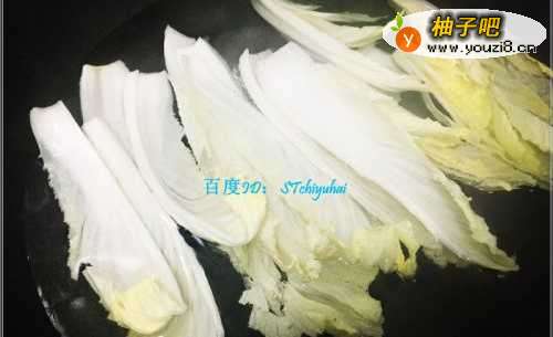 3优先烫白菜心,将白菜心放入热水中烫一下,直至白菜杆变透,将其捞出沥干,然后取一个盘子,将白菜心平铺放置。