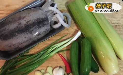 鱿鱼洗净清除腹腔;小黄瓜、蒜头、辣椒、葱洗净备用