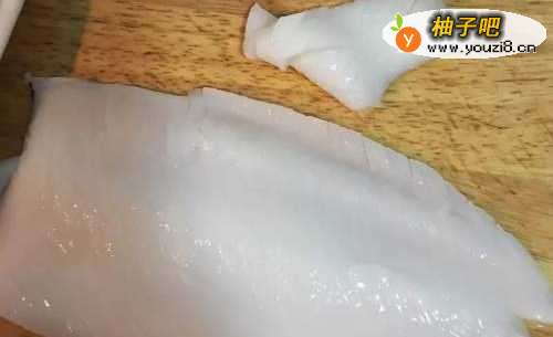 2鱿鱼剥除里外的薄皮后,剥下两边的侧翼,将主体对切,从内部那面斜刀切花,将鱿鱼转向再切一次,便可片成适当的大小;两片侧翼也是同样的切法