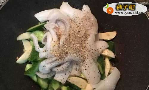 5放入鱿鱼和除了酒之外的调味料,炒匀